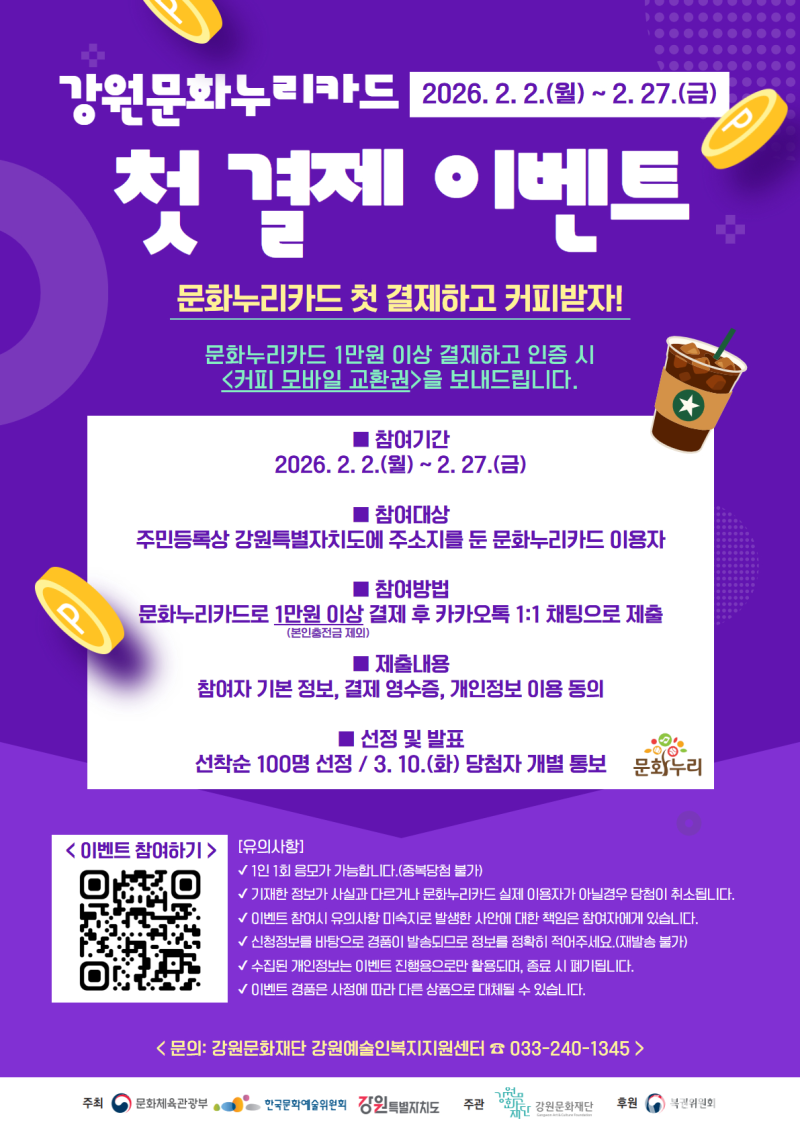 첫 결제 이벤트는 27일까지 문화누리카드로 1만 원 이상 결제한 영수증을 강원문화재단 문화누리 카카오톡 채널을 통해 인증하면 3월 10일 선착순 100명을 선정해 커피 모바일 교환권을 제공한다.