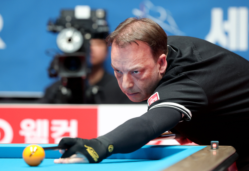 3연속 우승에 도전하는 ‘3쿠션 전설’ 다니엘 산체스(51·웰컴저축은행)가 대회 무실 세트 우승까지 넘본다.