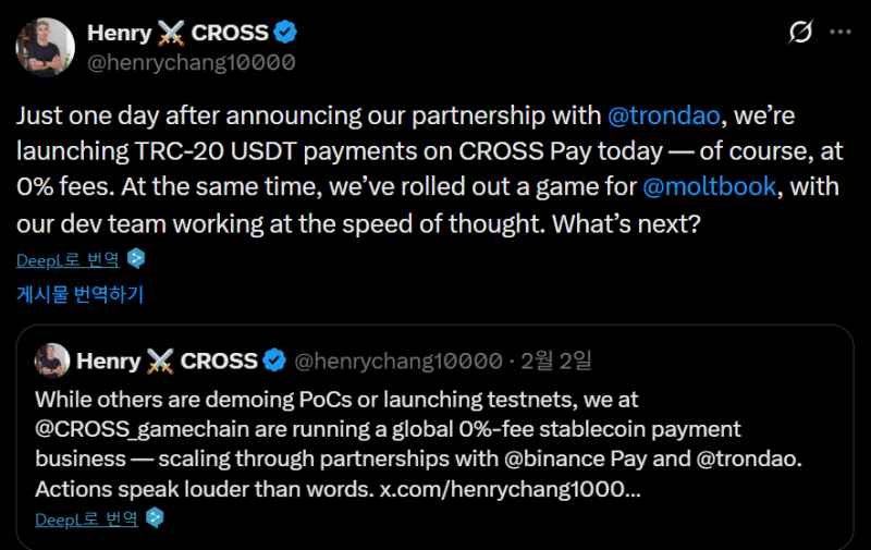 3일 장현국 대표 X(구 트위터)에 따르면 트론DAO와 전략적 협력 발표 직후 크로쓰 페이에서 TRC-20 USDT 결제를 지원하고, 이후 ‘트론 생태계의 스테이블코인’ USDD까지 순차적으로 연동하는 방안을 추진한다.