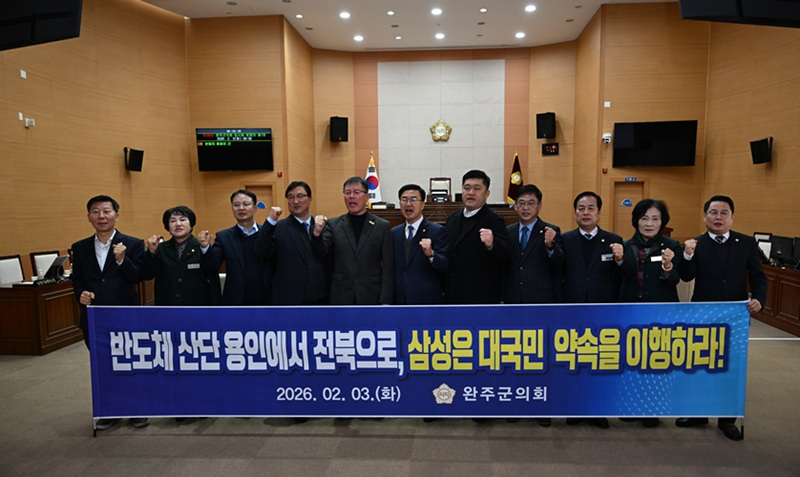이에 완주군의회는 건의안을 통해 ▲삼성전자의 용인 반도체 팹 새만금 분산 배치 즉각 추진 ▲정부의 수도권 중심 반도체 전략 수정 및 새만금 이전 지원 ▲전주-완주-새만금을 잇는 ‘남부권 반도체 벨트’ 구축 등을 촉구했다.
