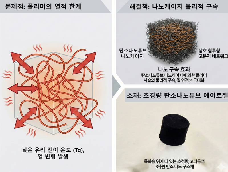 연구팀은 탄소나노튜브 가루를 단순히 섞는 기존 방식은 뭉침 현상 때문에 효과가 떨어졌지만, 에어로젤 형태의 뼈대를 먼저 만드는 방식으로 이 문제를 해결했다.