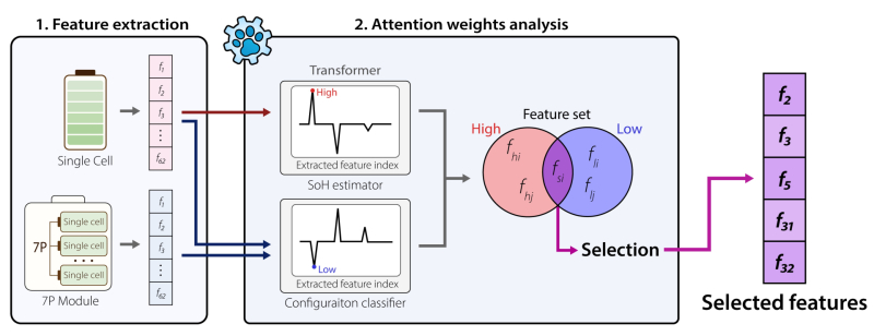 개발된 모델은 어텐션 알고리즘을 활용해 배터리 수명을 예측할 때는 높은 중요도를, 반대로 배터리 형태를 구분하는 데는 낮은 중요도를 보이는 데이터 패턴만을 교집합으로 선별한다.