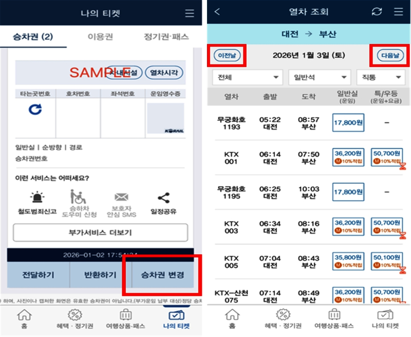 변경 가능한 열차 범위도 기존 승차 당일 열차로 한정됐지만, 같은 구간은 승차일 기준 앞·뒤 7일 이내 운행하는 열차 중 자유롭게 고를 수 있다.