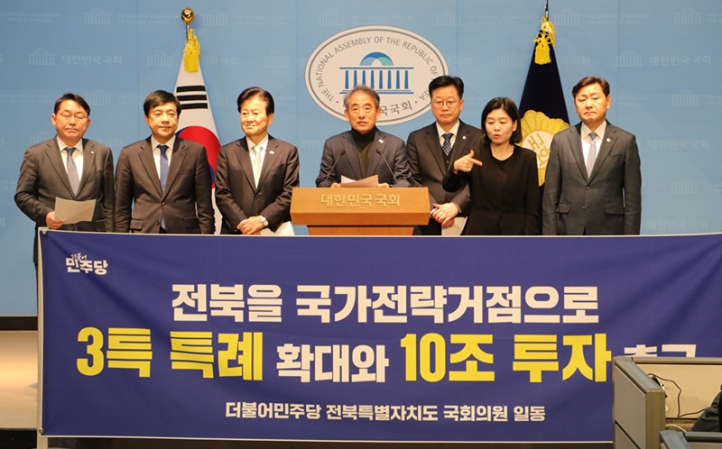 더불어민주당 소속 전북 의원들은 4일 국회 소통관에서 합동 기자회견을 열고, “국가균형발전 전략의 결정적 골든타임에 전북이 다시 소외돼서는 안 된다”며 3특(전북·제주·강원) 특례 확대와 최소 10조원 규모의 국가 투자를 정부와 국회에 강력히 촉구했다.