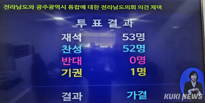 4일 오전 전남도의회는 제396회 임시회 제2차 본회의를 열고 ‘전라남도와 광주광역시 통합에 대한 전라남도의회 의견 청취의 건’을 재적 60명 중 53명이 참석, 찬성 52명, 기권 1명으로 가결했다.