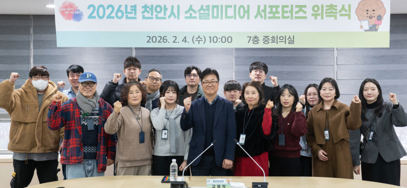 시는 4일 시청에서 2026년 소셜미디어 서포터즈 위촉식을 열었다. 고병학 홍보담당관은 “높은 경쟁률을 뚫고 선발된 여러분은 단순한 전달자가 아닌 천안시의 소중한 홍보 파트너”라며 “시민들이 공감할 수 있는 고품질 콘텐츠로 천안의 매력을 널리 알려주길 바란다”고 당부했다.