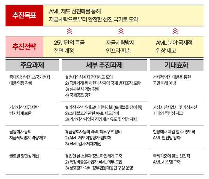 정부가 마약·도박 등 민생침해 범죄를 뿌리 뽑고 가상자산을 악용한 지능적 자금세탁을 차단하기 위해 국가 자금세탁방지(AML) 체계를 25년 만에 전면 개편한다. 범죄 의심 계좌를 즉시 동결하는 ‘의심계좌 정지제도’를 도입하고, 가상자산과 전문직 등 사각지대를 제도권으로 편입해 지능화되는 자금세탁 수법에 총력 대응한다는 구상이다.