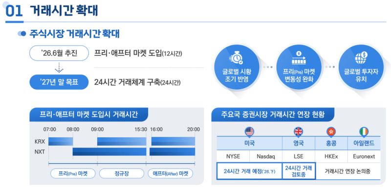 거래 환경 개편도 속도를 낸다. 거래소는 오는 6월부터 오전 7~8시 프리마켓, 오후 4~8시 애프터마켓을 도입해 하루 12시간 거래체계를 구축한 뒤, 2027년 말 24시간 주식 거래를 목표로 한다. 정 이사장은 올해 증시 개장식에서도 “24시간 거래체계 구축 등으로 자본시장 경쟁력을 강화하겠다”고 강조한 바 있다.