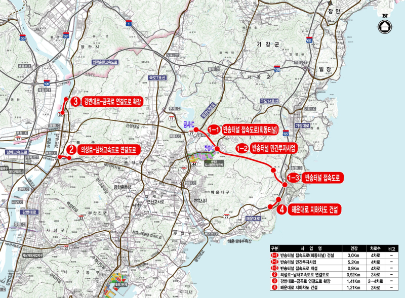 4개 사업은 총 6539억 원 규모다. 반송터널, 의성로~남해고속도로 연결도로 , 강변대로~금곡로 연결도로 확장, 해운대로 지하차도 건설이 포함된다.
