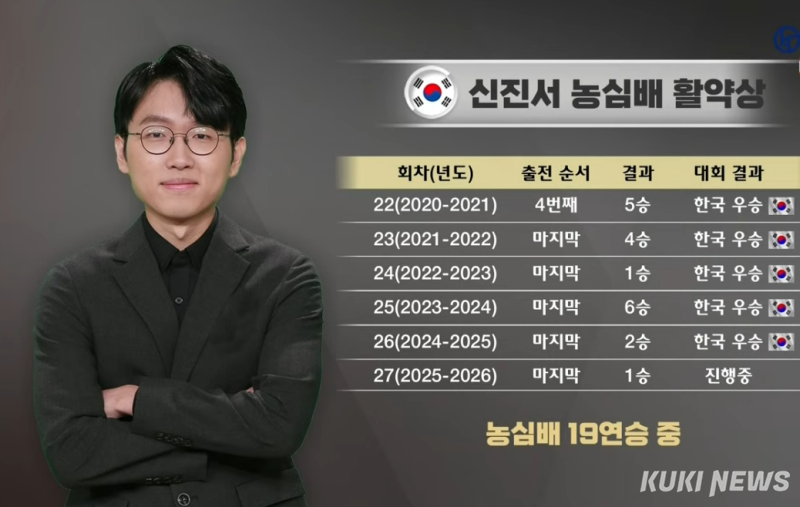 ‘농심배 끝판왕’으로 신기록을 연일 경신하고 있는 신진서 9단은 하루 전 이야마 유타 9단의 연승을 저지하고 19연승을 기록했다. 이날 대국도 승리한다면 ‘20연승’이라는 전무후무한 기록을 세우게 된다. 신 9단은 현재 두텁게 초반을 짠 이후 좌변 흑(왕싱하오) 돌을 공격하면서 국면을 풀어가고 있다.