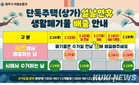 장성미 원주시 자원순환과장은 “연휴 기간 생활폐기물 수거 일정을 참고하셔서 깨끗한 원주시를 함께 만들어 주시길 바란다”고 말했다.