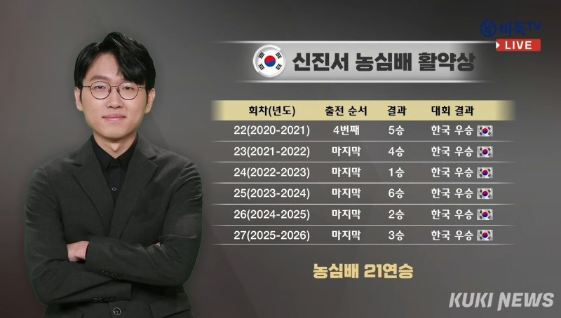 신 9단은 2021년 제22회 대회부터 올해 제27회 대회까지 단 한 판도 패하지 않고 ‘21연승’이라는 전무후무한 기록을 세우면서 대회 6연패를 이끌었다. 6번의 우승을 하면서 1승, 2연승, 3연승, 4연승, 5연승, 6연승을 모두 한 번씩 기록하는 진기록도 달성했다.