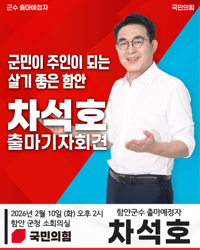 한편 이번 기자회견에는 지역 언론 관계자들이 참석할 예정이며 출마 선언을 계기로 함안군수 선거 구도가 본격화될 것으로 전망된다.