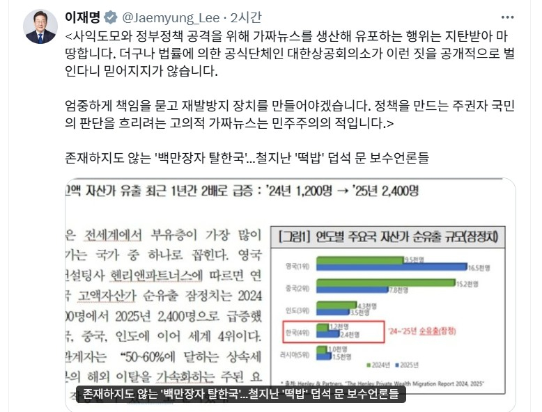 이재명 대통령은 7일 한국의 자산가 탈출 현상이 급증했다는 대한상공회의소의 보도자료에 대해 “고의적 가짜뉴스”라고 비판했다.
