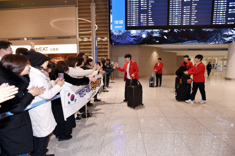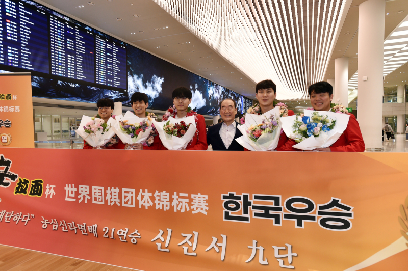 이날 입국장에는 취재진과 한국기원 관계자, 우승을 축하하기 위해 마중 나온 바둑팬들이 모여 선수들의 귀국을 반겼다. 환영식에 참석한 정태순 한국기원 이사장은 신진서 9단을 비롯한 한국 대표 선수들에게 격려와 박수를 전했고, 이광순 한국여성바둑연맹 회장과 회원들은 꽃목걸이와 꽃다발을 전달하며 환영의 뜻을 더했다.
