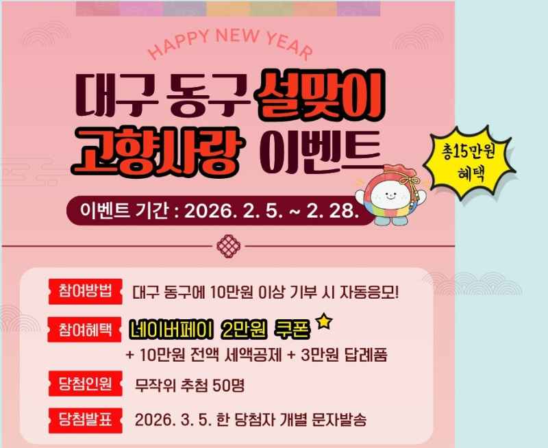 윤석준 동구청장은 “병오년 설을 맞아 고향을 응원하는 따뜻한 마음에 실질적 혜택을 더하고자 이번 이벤트를 준비했다”며 “앞으로도 동구만의 경쟁력 있는 답례품과 다양한 행사를 통해 고향사랑기부제가 더욱 활성화되도록 노력하겠다”고 말했다.