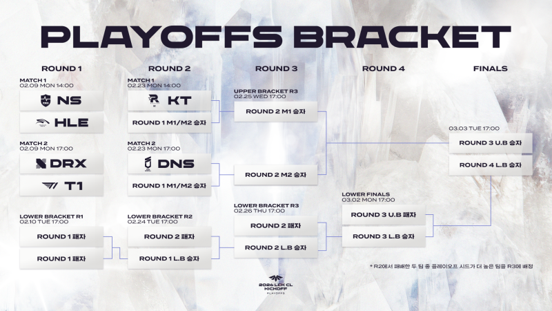 2026 LCK CL 킥오프 플레이오프는 9일부터 WDG 스튜디오 홍대에서 오프라인으로 진행된다. 오후 2시에는 농심 레드포스와 한화생명e스포츠가, 오후 5시에는 DRX와 T1 아카데미가 맞대결을 펼친다. 플레이오프의 대미를 장식할 결승전은 오는 3월3일 열린다.
