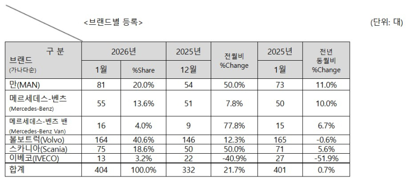 한국수입자동차협회(KAIDA)는 지난달 수입 상용차 신규 등록 대수가 총 404대로 집계됐다고 9일 밝혔다. 전년 동월 대비 0.7% 상승했다.