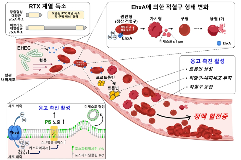 한국연구재단은 충남대 정한영 교수팀과 한양대 배옥남 교수팀이 공동연구로 장출혈성 대장균의 ‘RTX 계열 독소(EhxA)’가 적혈구를 조작해 혈전 형성을 유도한다는 사실을 입증했다고 9일 밝혔다.