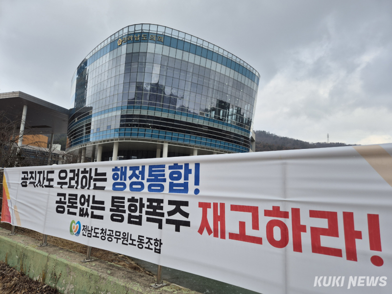 전남‧광주 행정통합에 대한 졸속논란이 끊이지 않고 있는 가운데 ‘공론 없는 통합 폭주 재고’를 요구하는 전남도청공무원노동조합의 현수막이 전남도의회 청사 옆 남악호수변에 걸려있다.