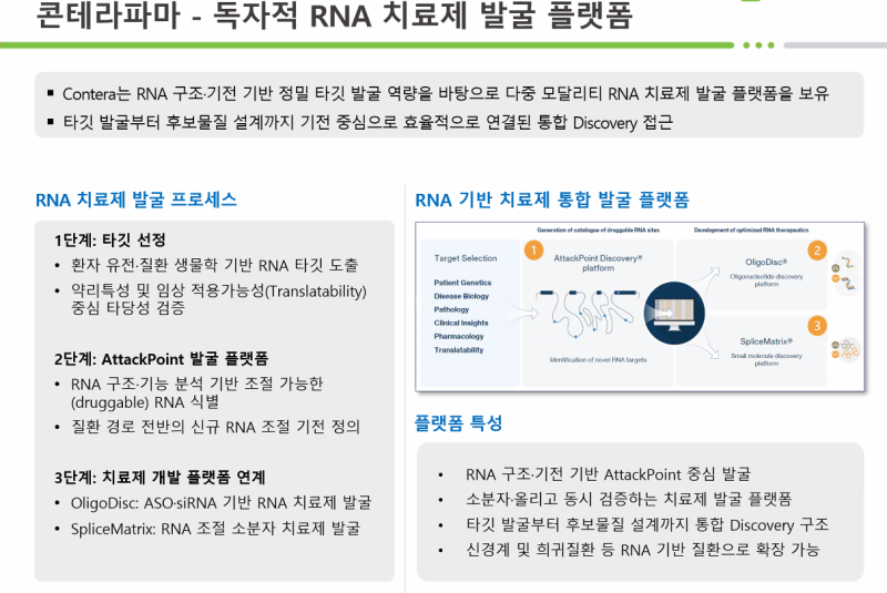 이 대표는 “룬드벡과의 계약 체결 이후 콘테라파마의 RNA 플랫폼에 대한 글로벌 제약사들의 관심이 증가하고 있다”며 “내달 말에는 일본 출장을 통해 글로벌 제약사 두 곳과 RNA 플랫폼을 소개하고 협력 가능성을 타진하는 미팅을 진행할 계획”이라고 전했다. 이어 “올해 안에 룬드벡과 비슷한 (규모의) 계약을 체결할 수 있도록 노력하고 있다”고 덧붙였다.