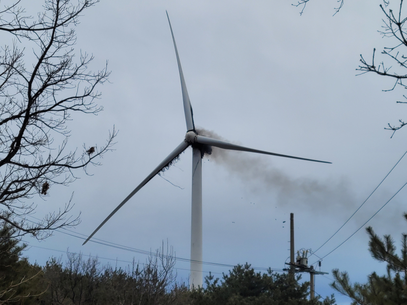 소방당국은 “풍력발전기에서 불이 났다”는 신고를 받고 출동해 진화 작업을 벌이고 있다.