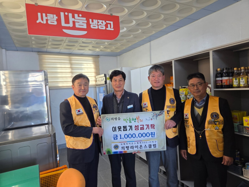 의령라이온스클럽(회장 박정철)은 9일 오후 2시 의령군 나눔냉장고 운영을 위한 물품 구입 성금 100만원을 기탁했다.