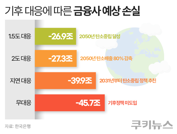 기후변화는 금융안정을 위협하는 요인이기도 하다. 한국은행·금융감독원이 공동 실시한 기후변화 스트레스 테스트에 따르면, 탄소 감축 정책을 얼마나 빨리 또 강하게 시행하느냐에 따라 국내 금융권 손실 규모가 크게 달라지는 것으로 나타났다. 전 세계가 2050년까지 탄소중립을 달성하거나 탄소배출을 80% 감축할 경우 예상 손실은 27조원 안팎에 그친다. 반면 기후위기에 별다른 조치를 취하지 않는 ‘무대응’ 시나리오에서는 상황이 급변한다. 이상 고온과 강수 피해로 인한 기업의 담보 가치 하락과 대출 부실, 투자 기업의 주가 폭락 등이 겹치면서 2100년까지 손실이 최대 45조7000억~46조원에 달하는 것으로 추산됐다. 대출이 주력인 은행의 경우 전체 예상 손실의 95% 이상이 신용손실에서 발생해, 장기적으로 은행 건전성을 흔들 수 있다는 경고가 나온다.