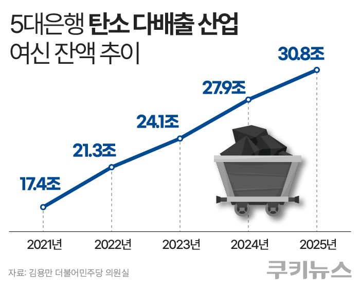 11일 쿠키뉴스가 국회 정무위원회 소속 김용만 더불어민주당 의원실을 통해 입수한 자료를 분석한 결과, 5대 시중은행(KB국민·신한·하나·우리·농협)의 한국표준산업분류(KSIC) 기준 6대 고탄소 업종 여신 잔액 합계는 지난해 말 기준 30조8057억원으로 집계됐다. 2021년 말(17조4174억원) 대비 76.9% 증가했다. 고탄소 업종에는 석탄광업, 코크스·연탄 및 석유정제품, 1차 금속, 비금속 광물제품, 화학 물질 및 화학제품 제조업, 화력발전업 등 6개 업종이 포함됐다.