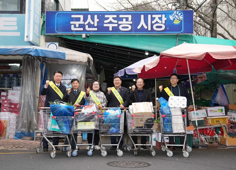 전북특별자치도의회는 설 명절을 앞두고 10일 군산 주공시장을 찾아 전통시장 상인들을 응원하며, 시장 활성화를 위한 장보기 행사와 함께 캠페인을 진행했다.