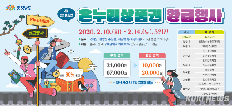 포스터. 충남도는 설 명절을 맞아 10일부터 14일까지 도내 7개 시군 12개 전통시장(연합포함 13개)에서 ‘온누리상품권 환급행사’를 실시한다.
