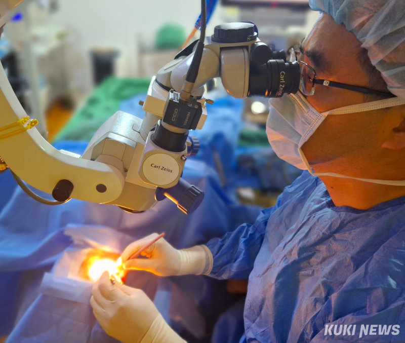 정민수 원장은 지난 9일 오전 숙련된 간호팀과의 긴밀한 협조 체계를 구축, 수술 중 머리를 움직이는 환자를 달래가며 안심시키는 동시에 점안 마취하에 단 10분 만에 오른쪽 눈 수정체 재건을 마쳤다.