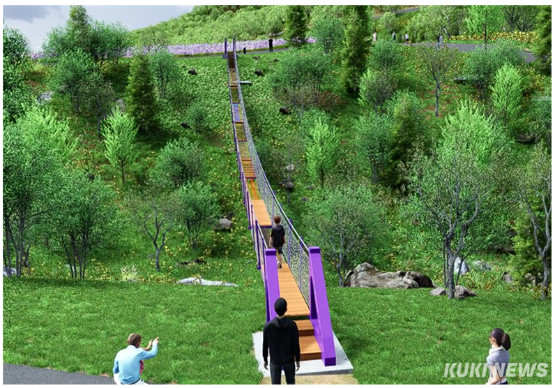 10일 동해시에 따르면 시는 올해 1월부터 5월까지 총사업비 2억 원(도비 1억·시비 1억)을 투입해 무릉별유천지 라벤더정류장과 호수보라정원 구간을 잇는 '하늘바람 출렁다리'를 설치한다. 출렁다리는 길이 65m, 폭 0.8m 규모의 케이블형 보도교로, 보행 동선을 확충하면서 '공중 보행'이라는 체험 요소를 결합한 시설이다.