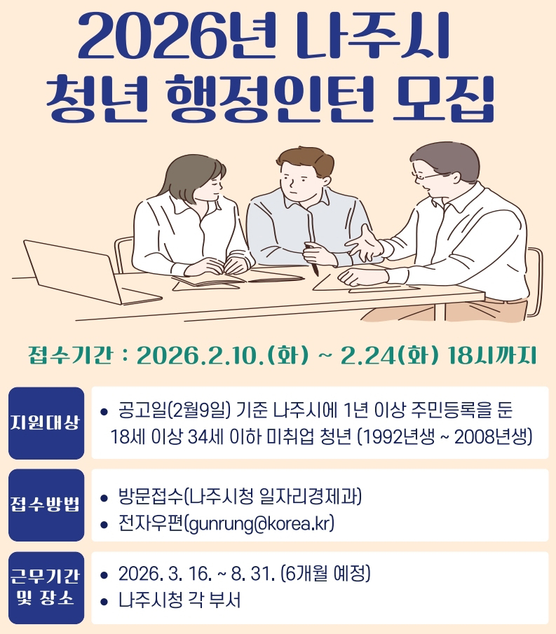 신청 대상은 공고일 기준 나주시에 1년 이상 주민등록을 두고 있는 만 18세 이상 34세 이하의 미취업 청년으로 서류 심사와 면접을 거쳐 선발된다.