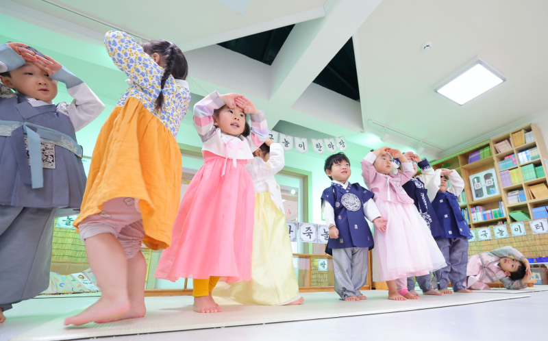 설 명절을 일주일 앞둔 10일 경남 함양군 성민어린이집 원생들이 예쁜 전통한복을 차려입고 떡국 만들기 놀이를 하고 있다.