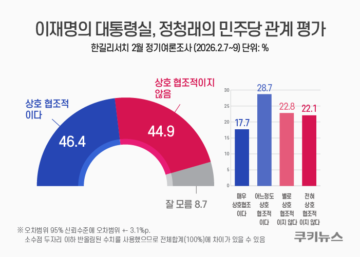 10일 쿠키뉴스 의뢰로 여론조사 전문기관 한길리서치가 지난 7일부터 9일까지 전국에 거주하는 만 18세 이상 남녀 1015명을 대상으로 ‘이재명 대통령의 대통령실과 정청래 지도부의 더불어민주당과의 관계’에 대해 물은 결과 ‘상호 협조적이다’라는 긍정 평가가 46.4%, ‘상호 비협조적이다’라는 부정 평가가 44.9%로 오차 범위 내에서 비슷한 수준으로 나타났다.
