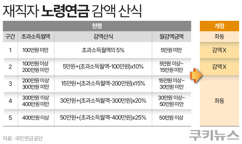 종전에는 국민연금 가입자의 3년간 평균소득월액(A값)을 넘으면 연금 수령액이 줄었다. A값은 지난해 월 309만원, 올해는 319만원이다. 올해 기준 1구간인 419만원 미만 소득자는 최대 5만원, 2구간인 419~519만원 미만 소득자는 최대 15만원이 감액됐다.