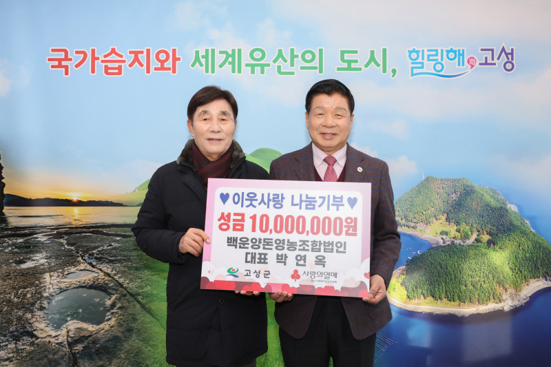 고성군 대가면 소재 ‘백운양돈 영농조합법인 박연옥 대표’는 2월9일 설 명절을 맞아 군청을 방문해 군내의 어려운 이웃을 위해 써 달라며 이웃돕기성금 1000만원을 전달했다.