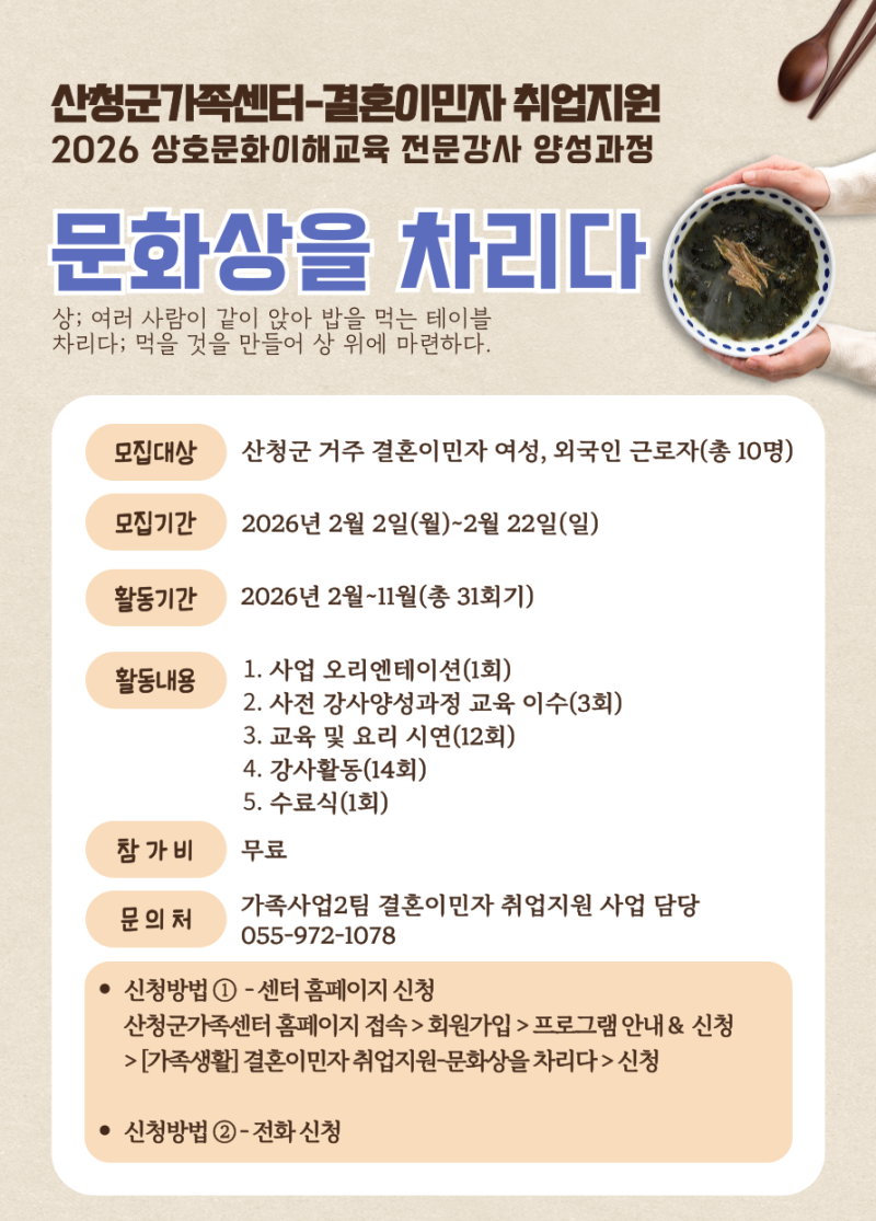 산청군가족센터(센터장 송윤주)는 결혼이민자의 안정적인 사회 참여와 취업 역량 강화를 위해 오는 22일까지 ‘상호문화이해교육 강사양성과정’ 참여자를 모집한다.