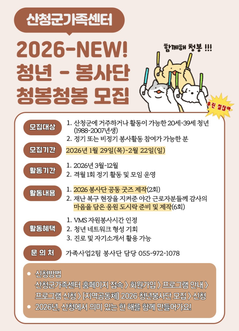 산청군가족센터(센터장 송윤주)는 오는 2월 22일까지 가족봉사단·청년 대상 봉사단인 ‘청봉청봉’ 참여자를 모집한다.