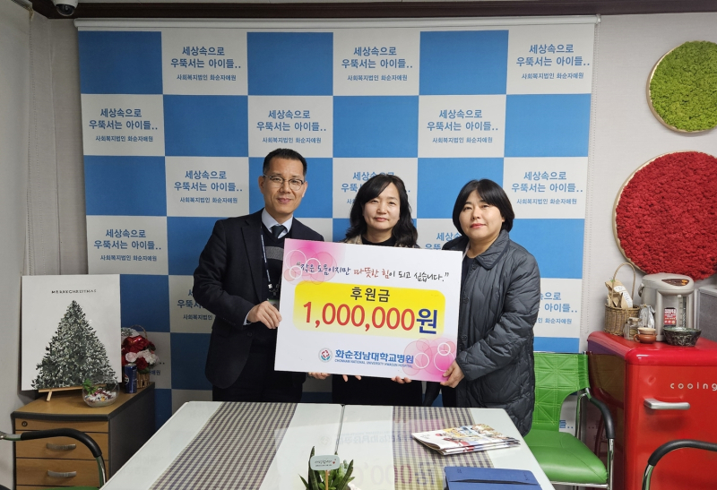 11일 화순전남대병원에 따르면 병원은 10일 전남 화순군 소재 소향원과 화순자애원, 해피타운 등 사회복지시설 3곳을 방문해 총 300만 원의 후원금을 전달했다. 이번 나눔은 각 시설별로 100만 원씩 배정되어 종사자와 이용자들의 명절 생활 안정에 사용될 예정이다.