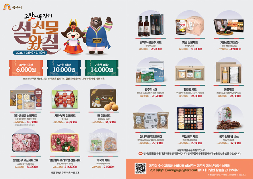 선정되면 공주시 농특산물 쇼핑몰 ‘고맛나루장터’에서 친환경·로컬푸드 인증품을 구매할 수 있는 마일리지를 받을 수 있다. 최대 48만 원이며 혜택은 400여 가구, 3월 중순때 배송된다. 신청은 2월 25일 마감한다.