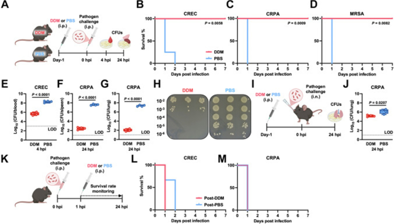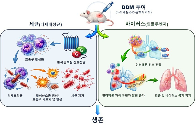 연구팀은 동물실험에서 감염 하루 전 DDM을 미리 한 번 투여하고, 이후 강력한 항생제 내성균과 독감 바이러스에 노출시켰다.