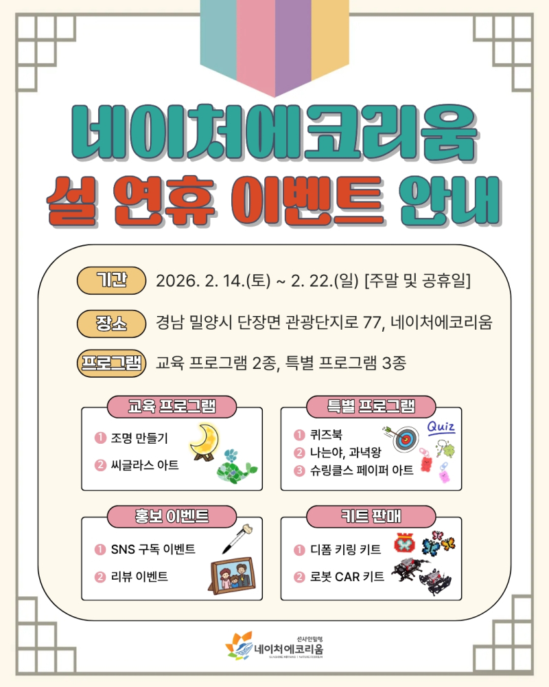 이번 행사는 주말 및 공휴일에 선샤인 밀양 테마파크 내 네이처에코리움에서 진행되며 명절을 맞아 가족이 함께 참여할 수 있는 체험형 프로그램을 통해 의미 있는 여가 시간을 제공하고자 기획됐다.