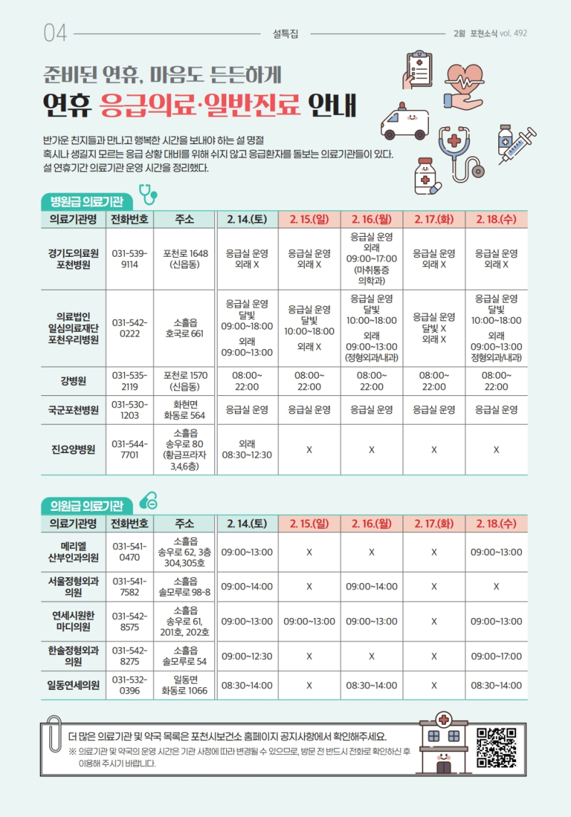 연휴 기간 진료가 가능한 병의원과 약국 정보는 포천시 보건소 누리집과 공식 누리소통망(SNS)을 통해 확인할 수 있으며, 응급의료정보제공 앱과 응급똑똑 앱을 통해서도 실시간 조회가 가능하다. 이와 함께 119 구급상황관리센터와 129 보건복지콜센터를 통해서도 관련 안내를 받을 수 있다.