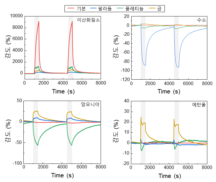 각 귀금속 촉매는 특정 가스에만 민감하게 반응하도록 설계함으로써 여러 가스가 섞인 환경에서도 수소, 암모니아, 에탄올, 이산화질소 등을 정확히 가려냈다.