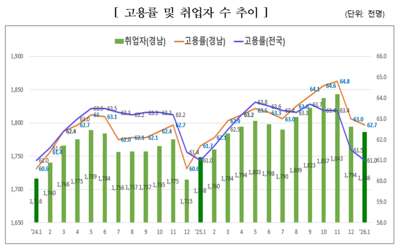 경남 1월 취업자가 1년 전보다 3만8000명 늘고 고용률이 62.7%로 오르며 1월 기준 역대 최고치를 기록했다. 전국 평균을 1.7%p 웃도는 수치로 경남은 6개월 연속 전국 고용률을 상회했다.