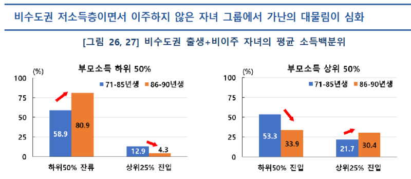 한은 조사국 지역경제조사팀이 경제협력개발기구(OECD)와 공동으로 분석한 ‘지역 간 인구 이동과 세대 간 경제력 대물림’ 보고서에 따르면, 비수도권 출신 부모 소득 하위 50% 가구의 1986~1990년생 자녀 가운데 80% 이상이 성인이 된 뒤에도 동일한 소득 계층에 머문 것으로 조사됐다. 같은 조건의 1971~1985년생은 59% 수준이었지만, 세대가 바뀌며 계층 이동성은 더욱 약화된 양상이다.