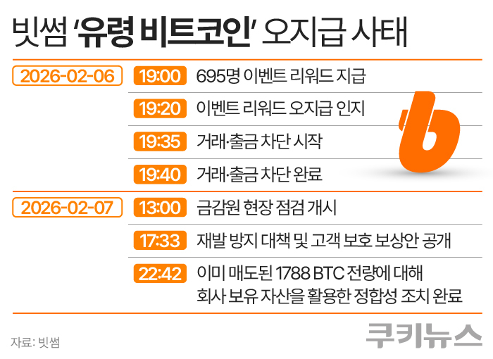 빗썸의 사고 인지와 대응 과정도 논란을 키웠다. 당시 빗썸은 오후 7시 리워드를 지급했고, 오지급 사실은 20분 뒤인 7시20분 인지했다. 이후 7시35분부터 거래·출금 차단에 착수해 40분께 완료했다는 게 회사 측 설명이다. 그러나 이용자 공지는 다음 날 00시23분에야 이뤄졌고, 사고 원인과 회수 현황은 새벽 4시30분 추가 공지됐다. 금융감독원이 오후 1시 현장 점검에 착수한 뒤에야 재발 방지 대책과 보상안이 공개됐다.