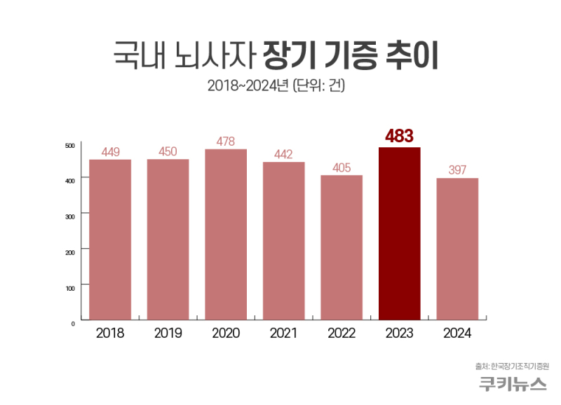 12일 보건복지부 국립장기조직혈액관리원(KONOS)에 따르면 뇌사자 장기기증 건수는 2020년 478건, 2021년 442건, 2022년 405건으로 코로나19 유행의 여파로 인해 저조했지만, 2023년 483건을 기록하며 회복세로 돌아섰다. 장기·조직 기증을 희망하는 사람들도 2021년 16만 명에 육박했다가 1년 뒤인 2022년 11만7584명으로 26% 급감한 뒤 코로나19가 주춤해진 2024년 들어 13만9090명으로 18% 증가했다.